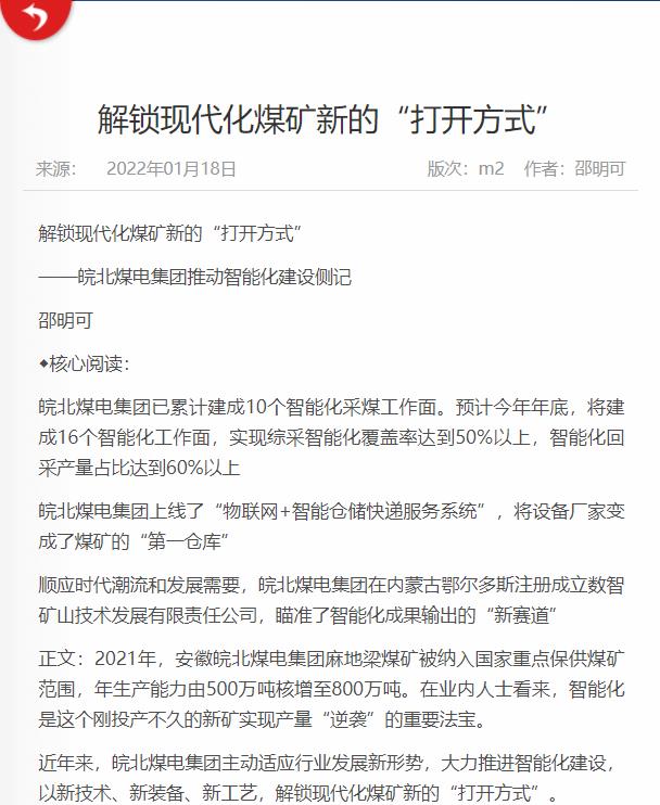2月15日《中国煤炭报》3版:皖北煤电麻地梁煤矿智能保安,让矿工放心上班