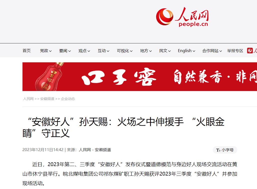 12月11日人民网:“安徽好人”孙天赐:火场之中伸援手 “火眼金睛”守正义