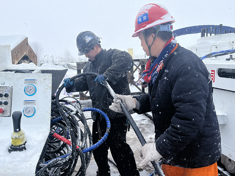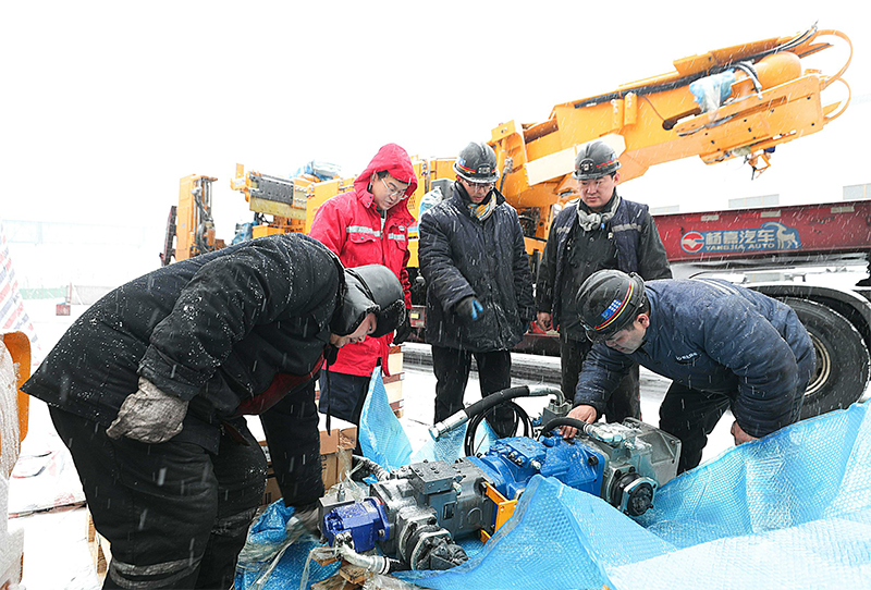 图片说明:麻地梁煤矿掘进区第二套掘锚成套装备装备顶风冒雪进场,组织精干人员开展设备组装工作。