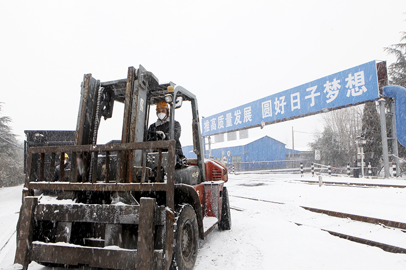 图一:美高梅赌场 恒源煤矿生产准备区职工正驾驶叉车冒雪来回运输物资、材料。