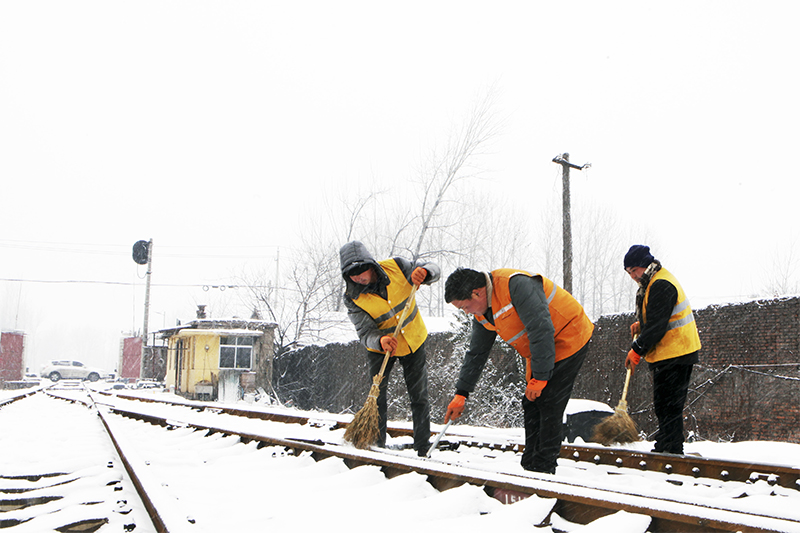 图二:该矿运销部组织职工在清扫线路道岔积积雪,保障铁路安全畅通。