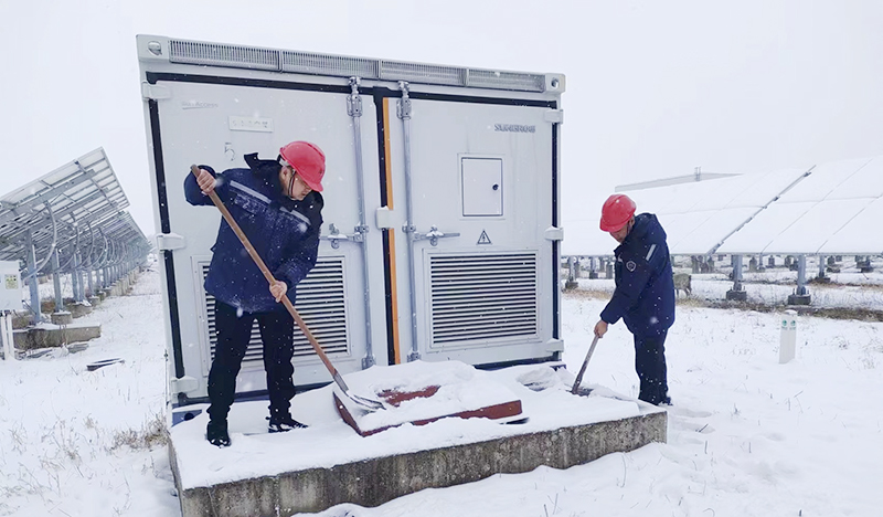 光伏电站工作人员及时清理逆变器周边积雪,保障设备安全运转。