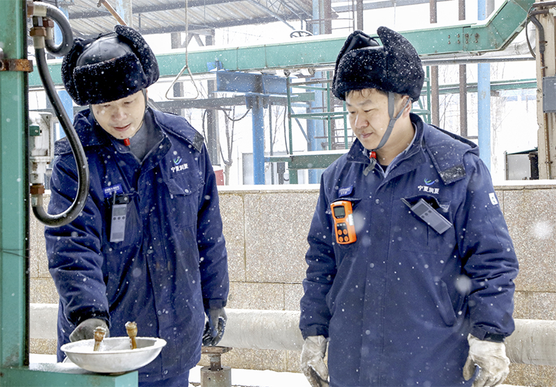 图片说明:2月3日,宁夏中卫市迎来了强降雪天气,天寒地冻、白雪飞舞,宁夏润夏能源化工公司浓硝酸车间三组现场巡检人员在装置现场检查重大危险源硝酸罐区洗眼器出水是否正常。